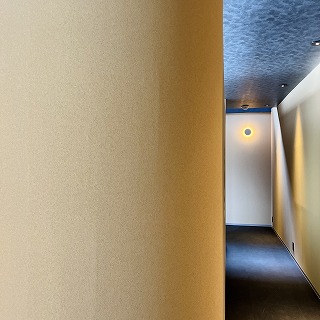 カウンターを横目に奥の廊下へ差し掛かる壁部分も、角が無くR面(丸まった面)となっております。(写真では伝わりづらいです、、)